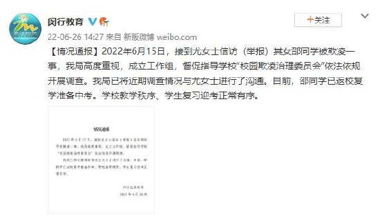 上海闵行教育局通报学生疑被欺凌一事