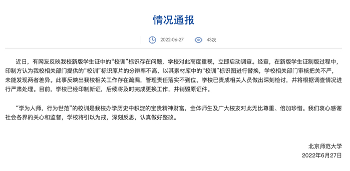 近日,有网友反映我校新版学生证中的“校训”标识存在问题,学校对此高度重视,立即启动调查。经查,在新版学生证制版过程中,印制方认为我校相关部门提供的“校训”标识原片的分辨率不高,以其素材库中的“校训”标识图进行替换,学校相关部门审核把关不严,未能发现两者差异。此事反映出我校相关工作存在疏漏,管理责任落实不到位。学校已责成相关人员做出深刻检讨,并将根据调查情况进行严肃处理。目前,学校已经印制新证,后续将及时完成更换工作,并销毁原证件。