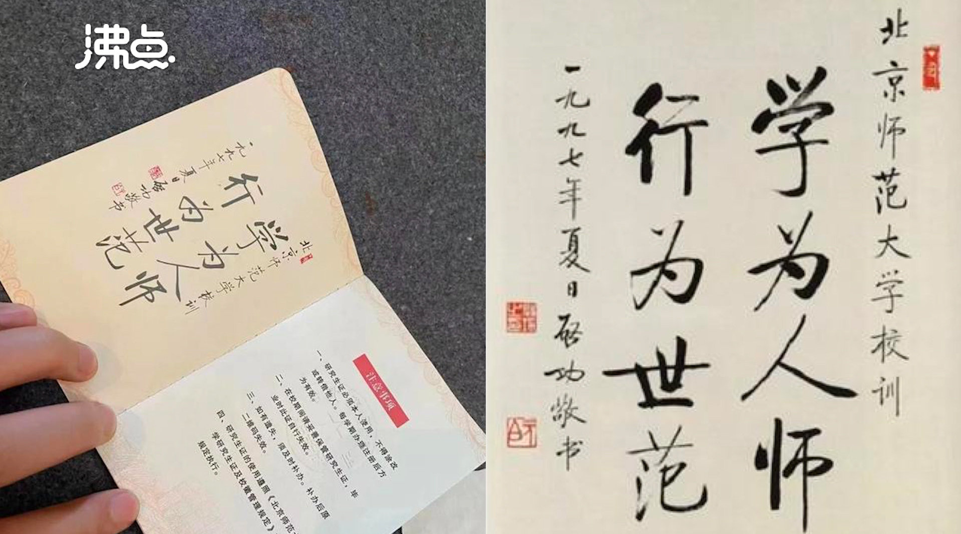 近日,有网友反映,北京师范大学学生证扉页印刷的书法家启功撰写的校训“学为人师,行为世范”疑为伪作,该消息引发热议。