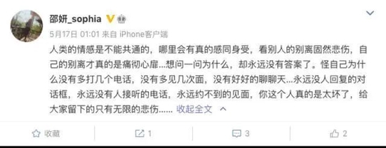 她其实在5月17日已经在自己微博上发文悼念季东燃,“人类的情感是不能共通的,哪里会有真的感同身受,看别人的别离固然悲伤,自己的别离才真的是痛彻心扉…想问一问为什么,却永远没有答案了。怪自己为什么没有多打几个电话,没有多见几次面,没有好好的聊聊天…永远没人回复的对话框,永远没有人接听的电话,永远约不到的见面,你这个人真的是太坏了,给大家留下的只有无限的悲伤……”