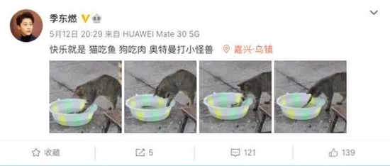季东燃的最有一条微博动态发布于今年5月12日,定位显示他在浙江乌镇,还分享了猫吃鱼的照片。