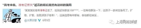 今年,上海高考因疫情延期至7月7日起举行,而在一个月前其他省市举行的高考中,已经出现过类似谣言,相关地区也发布了提示,建议公众不要轻信这类消息,更不要随意拨打短信中的电话号码。