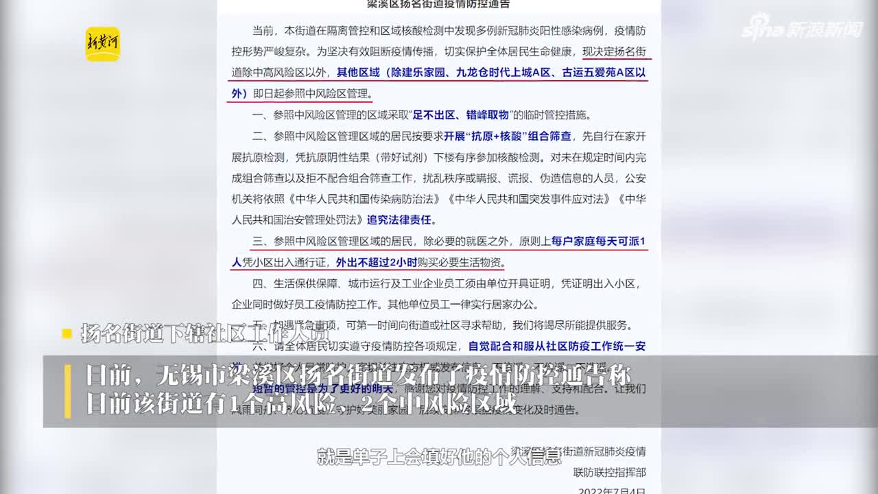 另有扬名街道办昨日发布的疫情防控通告显示,该街道在隔离管控和区域核酸检测中发现多例新冠肺炎阳性感染病例,疫情防控形势严峻复杂。因此决定扬名街道除中高风险区以外,其他区域(除建乐家园、九龙仓时代上城A区、古运五爱苑A区以外)即日起参照中风险区管理,即采取“足不出区、错峰取物”的临时管控措施,除必要的就医之外,原则上每户家庭每天可派1人凭小区出入通行证,外出不超过2小时购买必要生活物资。记者采访得知,出入通行证由各社区(小区)自行印发。