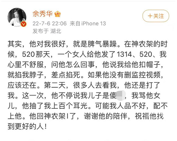 近日,余秀华被男友杨槠策家暴一事引发关注,事发后当地警方、妇联以及残联介入。7月6日,余秀华在其微博中提到,杨槠策对她很好,但就是脾气暴躁,曾掐她脖子、扇耳光。