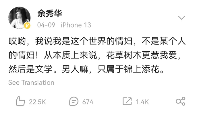 与杨槠策相处,让人们再一次见证了她的离经叛道。有人形容她“恋爱脑”“一个极度渴望爱情的农妇”,不明白他是图她的名气和钱财。