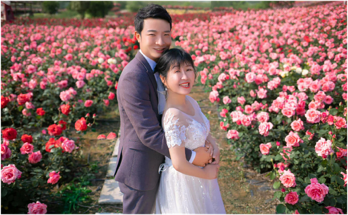 大捧的玫瑰花,象征忠诚的白纱,两人笑靥如花。