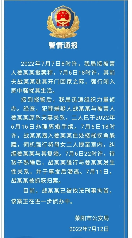 7月12日中午,莱阳市公安局发布正式通报称,犯罪嫌疑人战某某与被害人姜某某原系夫妻关系,二人已于2022年6月16日办理离婚手续。7月6日18时许,战某某潜入姜某某住处楼梯拐角躲藏,伺机强行将母女二人拽至室内,纠缠姜某某与其复婚。7月6日22时许,待孩子熟睡后,战某某强行与姜某某发生性关系,并于事发后潜逃。目前,战某某已被依法刑事拘留。