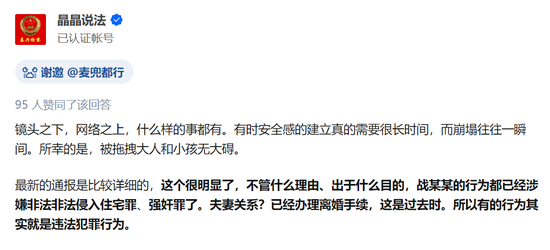 答主江苏省泰兴市人民检察院“晶晶说法”表示,不管什么理由、出于什么目的,战某某的行为都已经涉嫌非法侵入住宅罪、强奸罪。