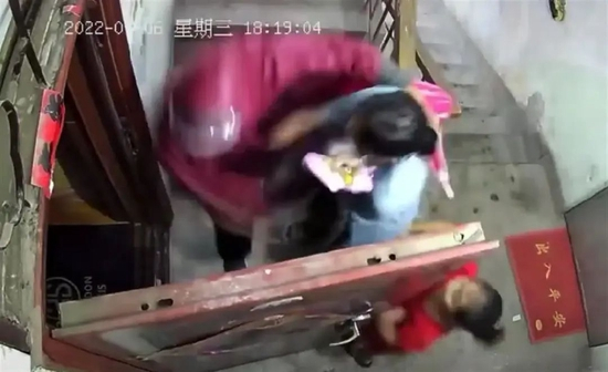 7月11日,一段疑似母女被雨衣男子强掳进屋内的监控视频在网上流传。监控显示,女子背着一个小书包,幼小的女儿跟在身后。刚打开房门,一名身披红色雨衣的男子便从楼上冲了下来。母女二人甚至未能反应过来,被吓得连声尖叫。自己的母亲先是被拽进屋内,没等小女孩反应过来,她也被一把拉了进去。