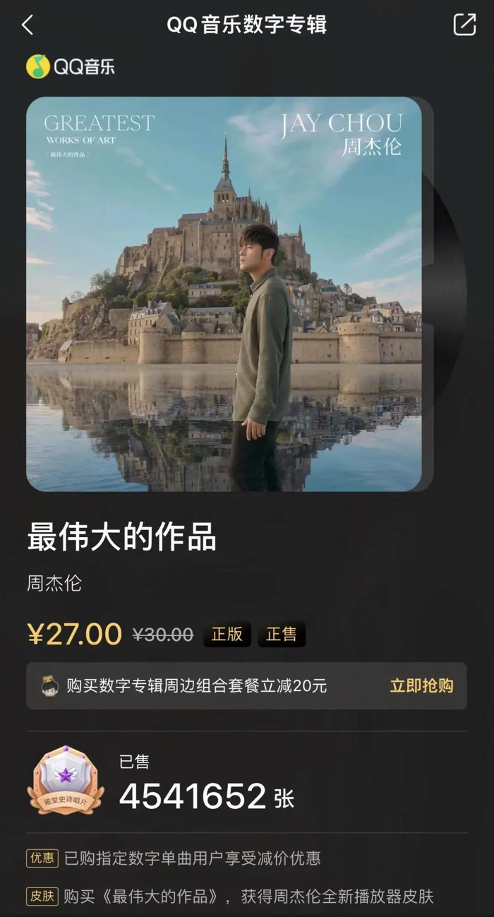 拥有周杰伦音乐独家版权的腾讯音乐,不仅销售大力推进专辑销售,还推出周杰伦新专限定播放器皮肤、新专限定APP装扮套餐、靓号铭牌等促销活动。