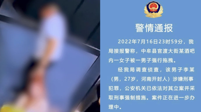 7月20日,“平安中牟”微信公号发布警情通报称,7月16日23时59分,我局接报警称,中牟县官渡大街某酒吧内一女子被一男子强行拖拽。经我局调查侦查,该男子李某(男,27岁,河南开封人)涉嫌刑事犯罪,公安机关已依法对其立案并采取刑事强制措施。案件正进一步办理中。