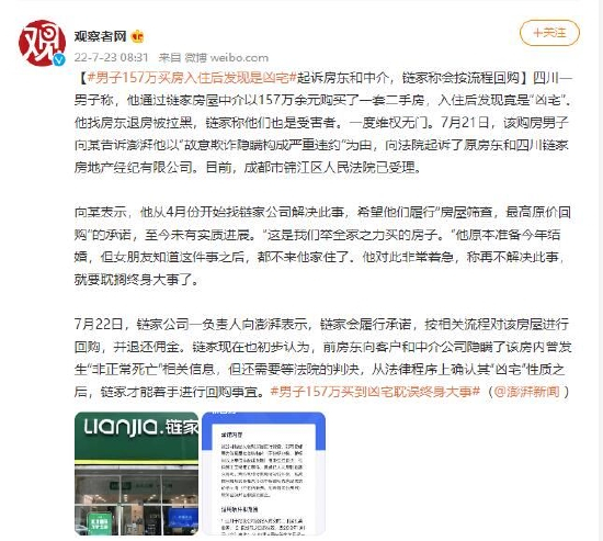 原发报道:男子157万买到“凶宅”起诉房东和中介,链家称会按流程回购(澎湃新闻)