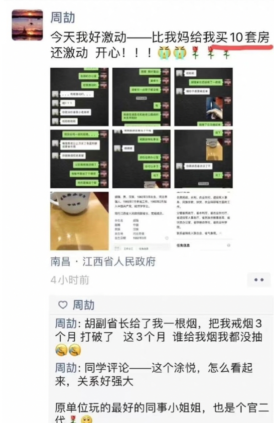近日,一组涉及“炫富”“秀后台”的朋友圈截图在网上引起广泛关注。截图显示,朋友圈属于一个叫“周劼”的人,此人自称是江西省国有资本运营控股集团有限公司的员工。