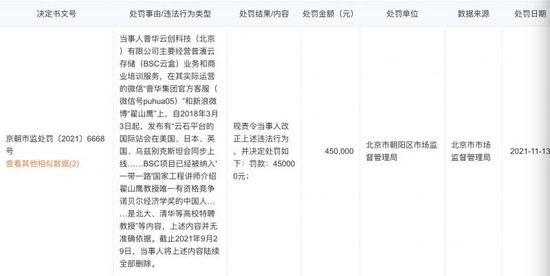 北青报记者还看到,2021年11月,因虚假宣传,翟山鹰旗下普华云创科技(北京)有限公司被朝阳区市场监督管理局处以45万元的处罚。朝阳区市场监督管理局调查认定,普华云创科技(北京)有限公司主要经营普滙云存储(BSC云盒)业务和商业培训服务,在其实际运营的微信“普华集团官方客服”和新浪微博“翟山鹰”上,自2018年3月3日起,发布有“云石平台的国际站会在美国、日本、英国、乌兹别克斯坦会同步上线……BSC项目已经被纳入‘一带一路’国家工程”、“讲师介绍:翟山鹰教授唯一有资格竞争诺贝尔经济学奖的中国人……是北大、清华等高校特聘教授”等内容,上述内容并无准确依据。截止2021年9月29日,当事人将上述内容陆续删除。