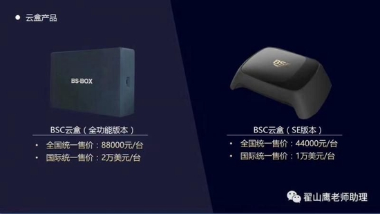 北青报记者从其官网看到,云盒分为两个版本,全功能版本售价8.8万,SE版本售价4.4万。介绍宣称,云盒最后会由政府采购,支付云服务租金,而这部分收益会分配给云盒用户。其收益为每年四次给予现金分配收益,收益取决于30余种变量,包括:BSC积分持有数量、积分的交易情况(净流入量越大,收益分配越高)、持有云盒的数量、个人信誉等。