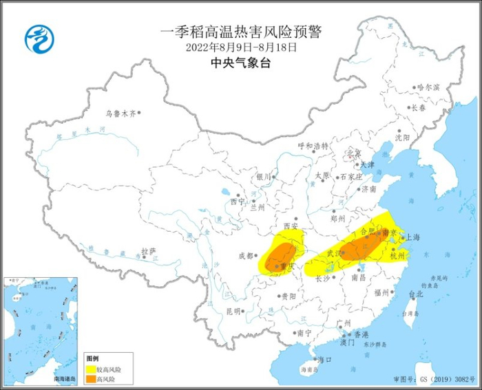 气象部门提醒,由于前期少雨,且8月23日前淮河以南仍无有效降水,并叠加大范围持续性高强度高温天气,淮河以南气象干旱将快速发展。8月8日,为降低高温热害对水稻生产造成的影响,安徽省农业农村厅网发布《一季中稻高温热害防控技术建议》,针对性防控高温热害。