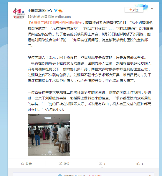 湘雅二院刘翔峰回应网传问题:请直接联系医院宣传部门
