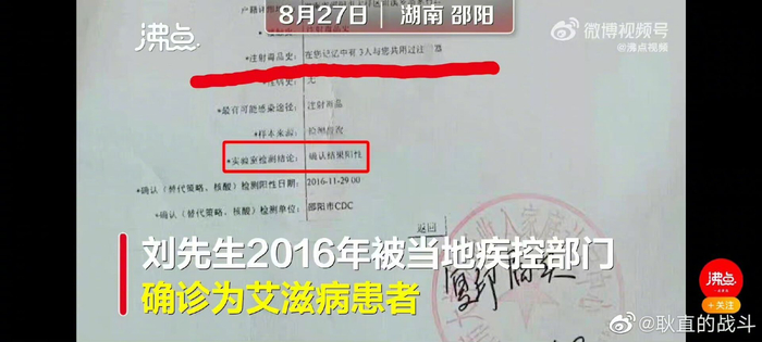 但也有人从视频中给出的一个几秒钟的画面中发现,在湖南邵阳疾控部门于2016年误诊刘先生染上艾滋病的一份文件上,可以看到其中的“注射毒品史”一栏写着“有3人与您共用注器”的内容。