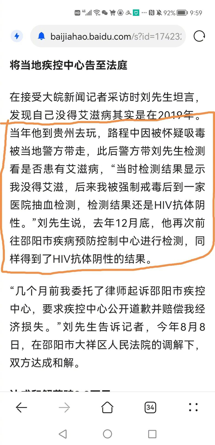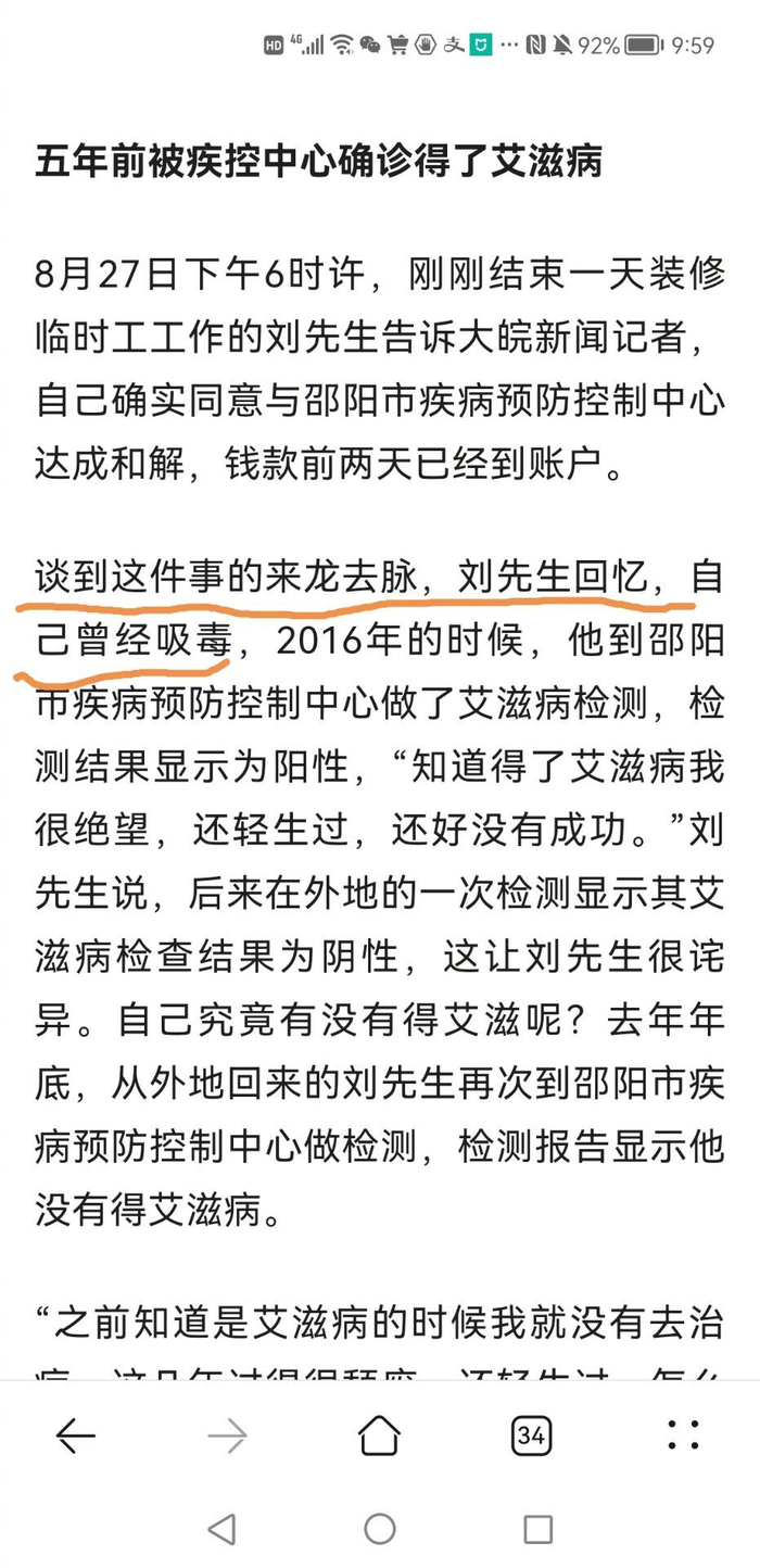 而安徽《新安晚报》“大皖看点”栏目在报道此事时,也给出了更详细的细节,称这名在2016年被湖南邵阳疾控部门误诊为艾滋病的刘先生是有吸毒史的,他自己也承认了此事。#被误诊艾滋病男子有吸毒史#