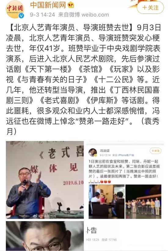 3个月前,北京人民艺术剧院演员,话剧导演班赞,也因突发心梗去世,享年41岁。