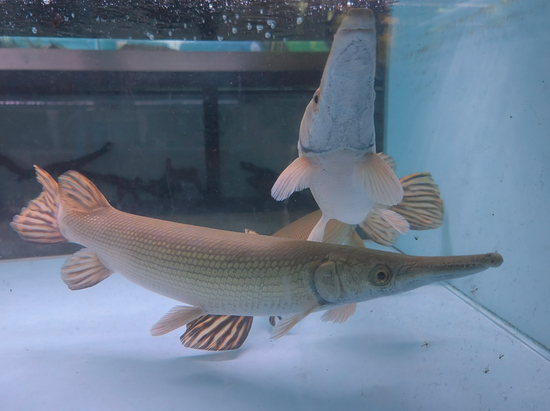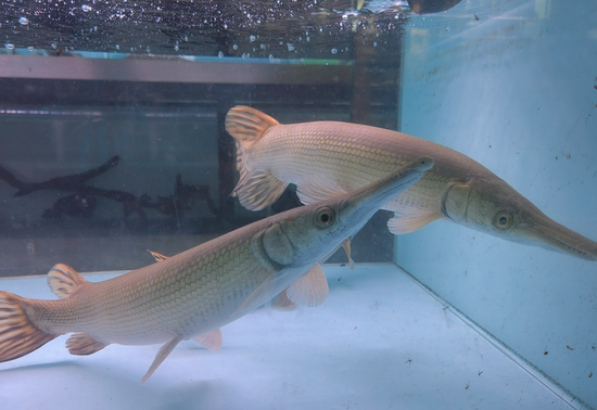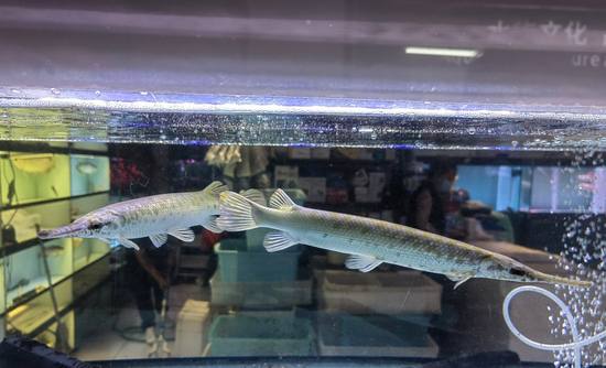 “想要鳄雀鳝?自己看,那边尖嘴的就是。”一位商户说,鳄雀鳝能养多大主要看鱼缸有多大,一般家里自己养的有半米长的。