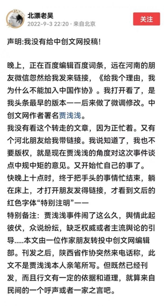 另据了解,这篇文章的作者是今年8月18日宣布退出陕西省作协会员的作家吴琼。9月3日晚,他在社交媒体账号上发声明称,“没有给中创文网投稿!”并称中创文网上的这篇文章是他最早的版本,他后来又做了微调修改。