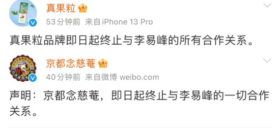 目前,真果粒、京都念慈菴等品牌已宣布即日起终止与李易峰的合作关系。