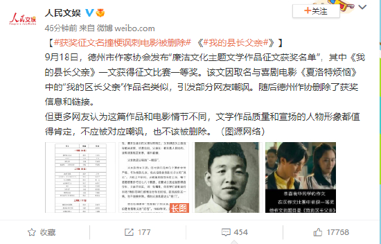 9月18日,德州市作家协会发布“廉洁文化主题文学作品征文获奖名单”,其中《我的县长父亲》一文获得征文比赛一等奖。该文因取名与喜剧电影《夏洛特烦恼》中的“我的区长父亲”作品名类似,引发部分网友嘲讽。随后德州作协删除了获奖信息和链接。