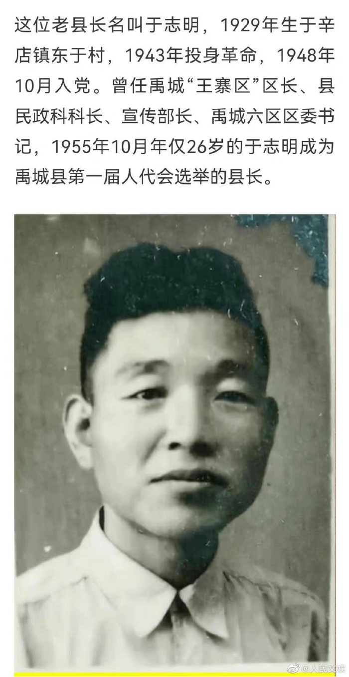 文章指出,于志明1929年生于辛店镇东于村,1943年投身革命,1948年10月入党。曾任禹城“王寨区”区长、县民政科科长、宣传部长、禹城六区区委书记,1955年10月年仅26岁的于志明成为禹城县第一届人代会选举的县长。