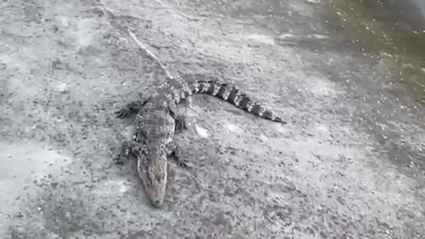 另据一则视频显示,一条鳄鱼趴在江岸边,围观市民在岸堤护栏外喊着“动了,动了”。