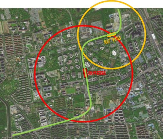 13号线扩能提升工程通车后,在中关村软件园区域,后厂村站900米半径范围可以覆盖软件园一期(黄圈),软件园站1500米范围可以覆盖整个软件园(红圈),并且13号线扩能提升工程在马连洼站可以和16号线实现换乘,将有效改善区域交通条件。