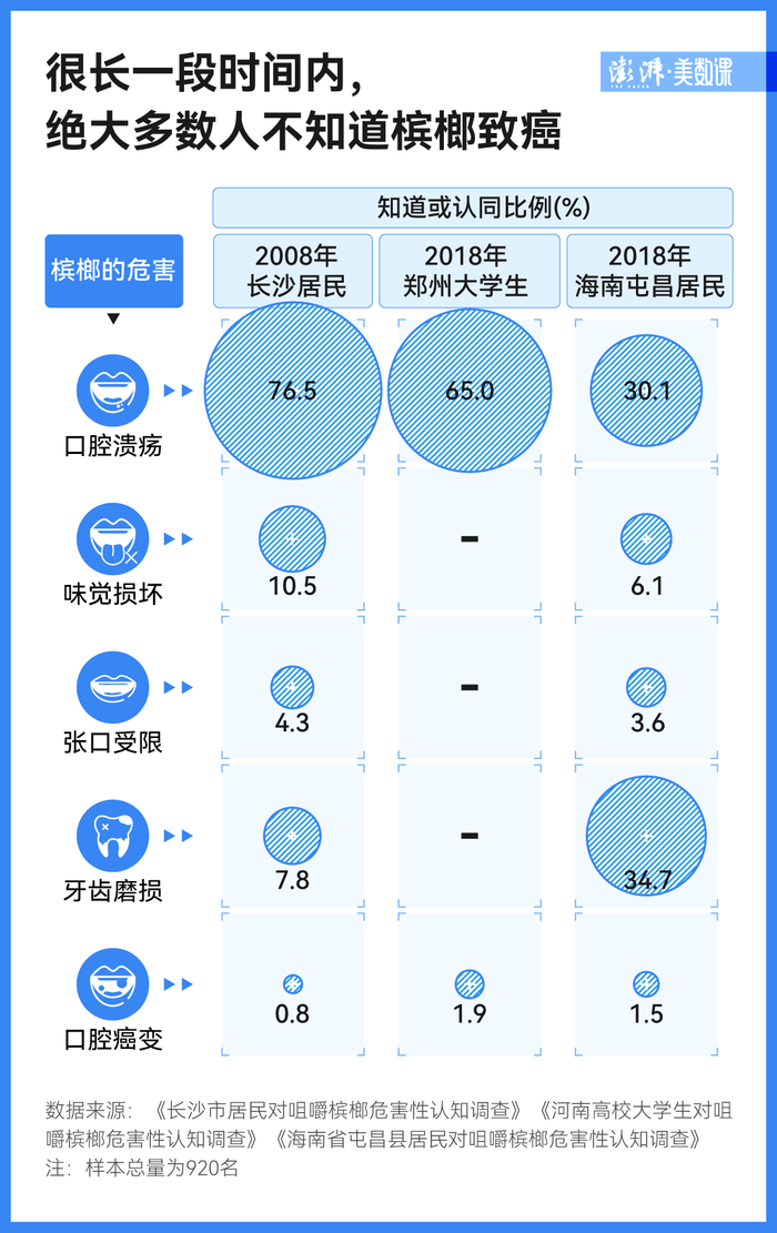 尽管早在2003年,世界卫生组织下属的国际癌症研究中心就明确了槟榔是一级致癌物,同在这张榜单里的还有酒精饮料和香烟。
