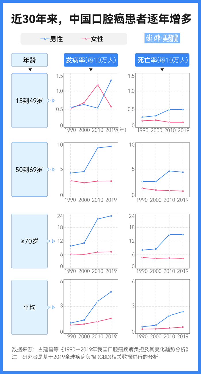 与此同时,中国的口腔癌发病率从1990年的每十万名男性1.16名患者,经过30年的攀升,增长到了4.62人。而70岁以上的人群数据更为惊人,每十万名男性中就有23.2人。