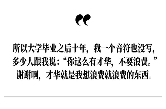 古今中外多少伟大的作品,在它们面前,我感到了渺小和无望。所以大学毕业之后十年,我一个音符也没写,多少人跟我说:“你这么有才华,不要浪费。”谢谢啊,才华就是我想浪费就浪费的东西。
