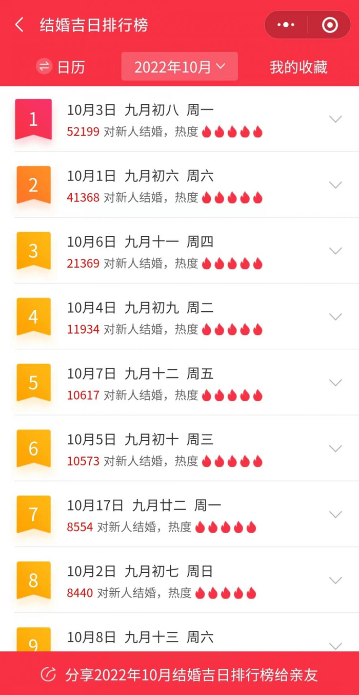 今年国庆节的婚礼,似乎比往年更多。湖南长沙的95后刘女士,在国庆前就收到了2份婚礼邀请,假期还没开始就emo(抑郁)了。一位浙江台州的网友爆料,自己国庆第一天就赶了4场婚礼,感觉比上班还累。安徽的网友“帆帆帆大”表示,自己10月3号去参加婚礼,结果酒店有20多对新人结婚,差点走错了地方。浙江宁波的网友“不吃葡萄”发帖吐槽,她今年国庆光份子钱就随出去快十份,已经好几千了,婚礼真能参加上的也没几场。而今年的10月3日,由于是黄历上适宜结婚的黄道吉日,成为了这个国庆假期最火爆的“全民结婚日”。
