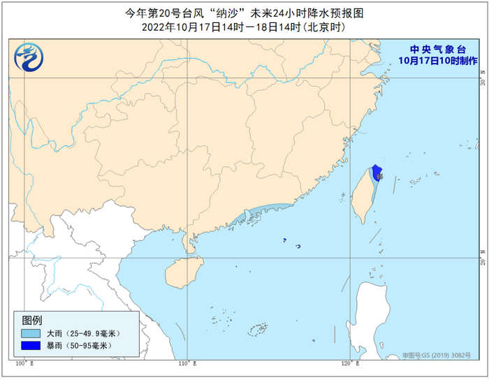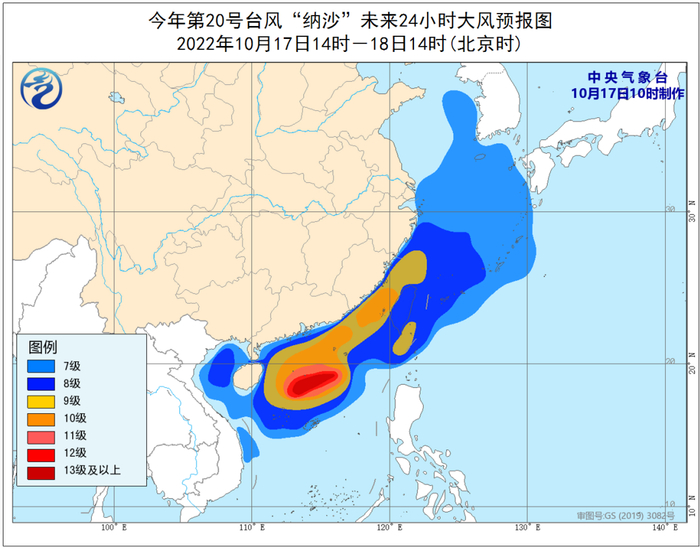 根据预报,17日白天至19日夜间,我国近海海域将有6至7级、阵风8级的风,其中东海大部海域、台湾海峡、台湾以东洋面、巴士海峡、南海北部和中部海域、北部湾东南部海域将有8至9级大风、阵风10至11级,台湾海峡、南海北部和中部部分海域风力可达10至11级、阵风12至13级。