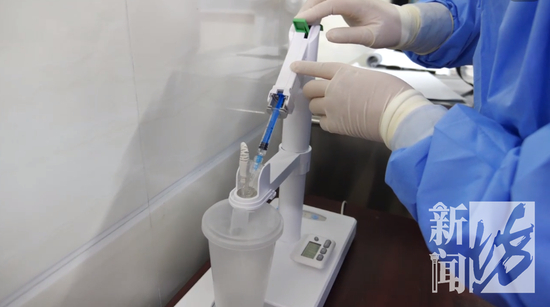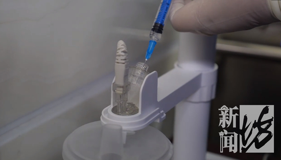 这个吸入式疫苗是一支三人份,每个人是0.1ml,机器设置好之后通过这个按钮推到底,就是0.1ml药液,雾化设置25秒,时间到雾化成功就可以吸入接种。