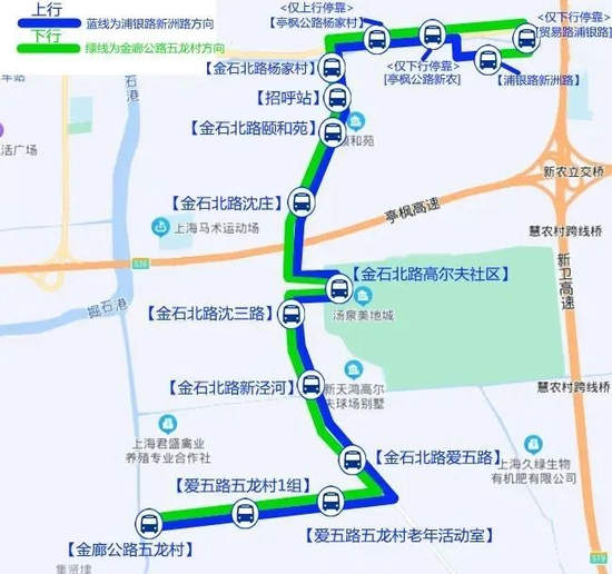 下行设站(金廊公路五龙村方向):浦银路新州路(农业银行)、贸易路浦银路(敬老院)、亭枫公路新农、金石北路杨家村、金石北路招呼站、金石北路颐和苑、金石北路沈庄、金石北路高尔夫社区、金石北路沈三路、金石北路新泾河、金石北路爱五路、爱五路五龙村老年活动室、爱五路五龙村1组、金廊公路五龙村。