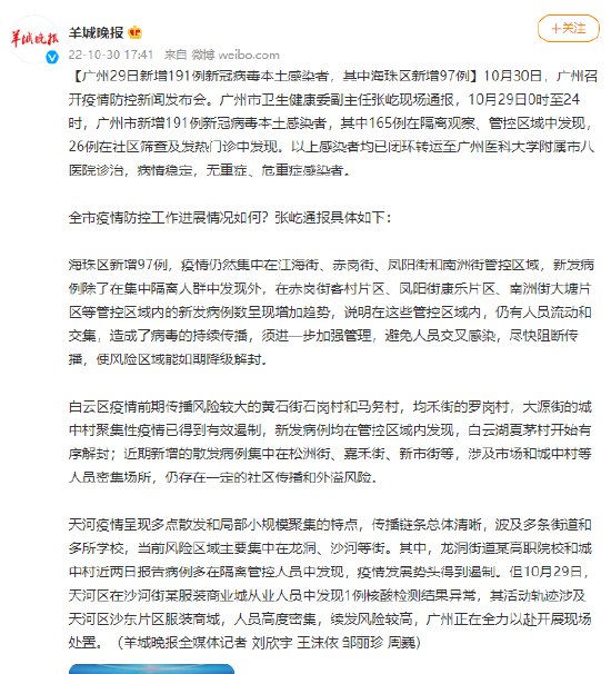 [广州29日新增191例新冠病毒本土感染者,其中海珠区新增97例]10月30日,广州召开疫情防控新闻发布会。广州市卫生健康委副主任张屹现场通报,10月29日0时至24时,广州市新增191例新冠病毒本土感染者,其中165例在隔离观察、管控区域中发现,26例在社区筛查及发热门诊中发现。以上感染者均已闭环转运至广州医科大学附属市八医院诊治,病情稳定,无重症、危重症感染者。