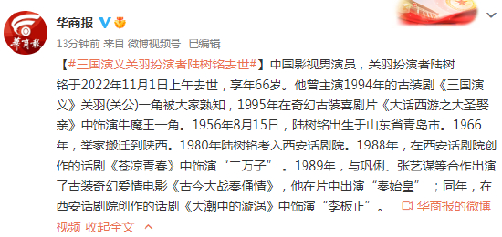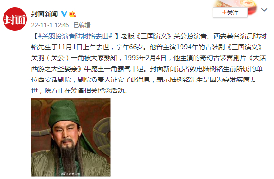 [#关羽扮演者陆树铭去世# ]老版《三国演义》关公扮演者、西安著名演员陆树铭先生于11月1日上午去世,享年66岁。他曾主演1994年的古装剧《三国演义》关羽(关公)一角被大家熟知,1995年2月4日,他主演的奇幻古装喜剧片《大话西游之大圣娶亲》牛魔王一角霸气十足。封面新闻记者致电陆树铭生前所属的单位西安话剧院,剧院负责人证实了此消息,表示陆树铭先生是因为突发疾病去世,院方正在筹备相关悼念活动。
