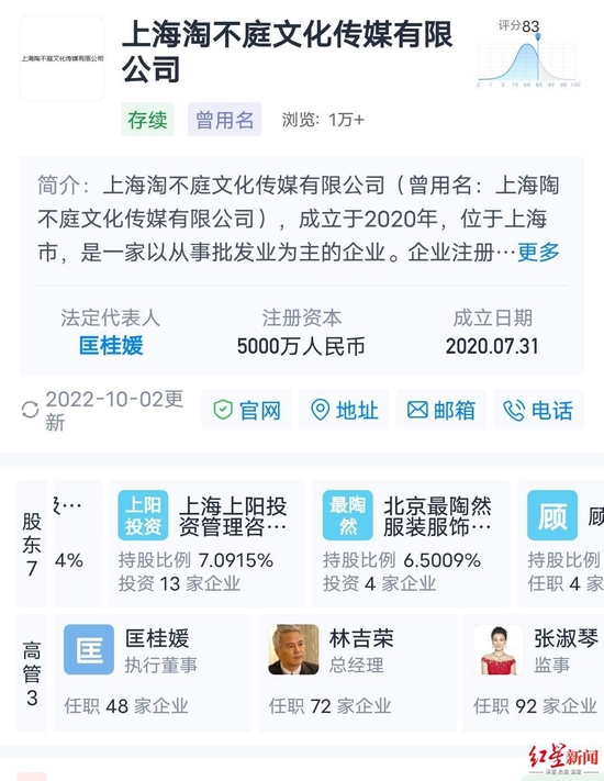 据悉,淘不庭是张庭和陶虹合资成立的公司。不过,2021年7月,该公司进行了名称变更,从陶不庭变为淘不庭。此后的11月15日,该公司发生了一次投资人(股权)变更,陶虹退出。不过,其百分百持股的最陶然依然位列股东名单。张庭担任法定代表人的上海胜极生物科技有限公司持有该公司83%的股份。