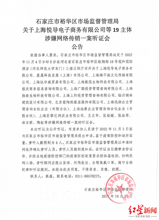 10月的最后一天,石家庄市裕华区市场监督管理局发布公告,上海悦导电子商务公司等19主体涉嫌网络传销一案听证会将于11月4日在石家庄召开。