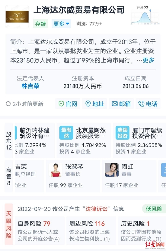 张庭、林瑞阳夫妇创办的化妆品品牌TST,主体即为上海达尔威。其官网介绍,TST品牌由林瑞阳、张庭于2013年创立,以化妆品、护肤品为主打品类。公开资料显示,上海达尔威成立于2013年,注册资本23180万人民币,法定代表人是张庭的老公林瑞阳(本名林吉荣),本名张淑琴的张庭则是董事长。