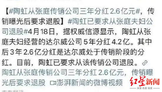 今年4月,据澎湃新闻报道,权威信源显示,陶虹从张庭夫妇经营的达尔威公司5年分红4.2亿。其中后3年2.6亿分红是达尔威处于传销阶段的分红。目前,陶虹已要求从该公司退股。随后,相关话题冲上热搜第二。