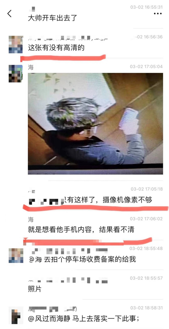 直到今年4月份,一位刘越认识的前物业主管离职后,向他提供了大量的微信群聊截图和视频,他这才意识到,自己这一年的一举一动都在物业经理和一个名为“大帅监控群”的微信群里被“直播”,“包括我几点出门,坐的哪部电梯,在哪家店吃饭都有记录,太恐怖了。”