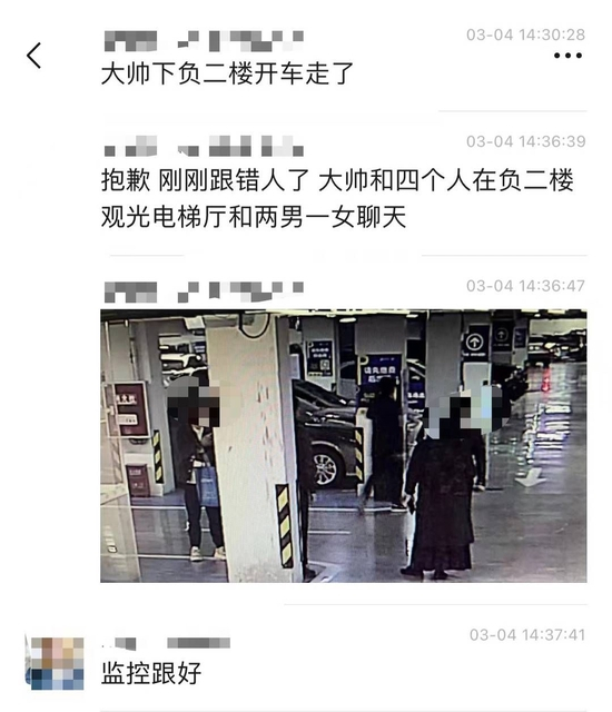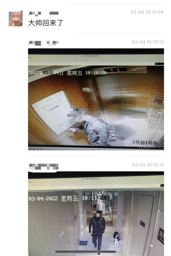 据刘越收集到的多份聊天记录显示,2021年3月10日,他牵着狗出小区大门的照片被拍下,一名物业工作人员称,“大帅带狗去环汇那边了”。当天22:56分,物业工作人员又在群里汇报,“大帅14:21回来,15:06出门往小区方向离去,18:27分回来的,22:14分往地铁站出口方向离去,未见回来。”