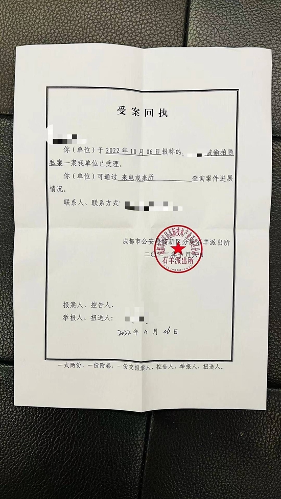 刘越猜测,他被监控可能跟成立业委会有关,“我是发起人,成立业委会的初衷是为了监督物业工作,完善物业服务。”目前,刘越以“被偷拍隐私”为由向成都市公安局高新公安分局石羊派出所报警,派出所出具了受案回执。