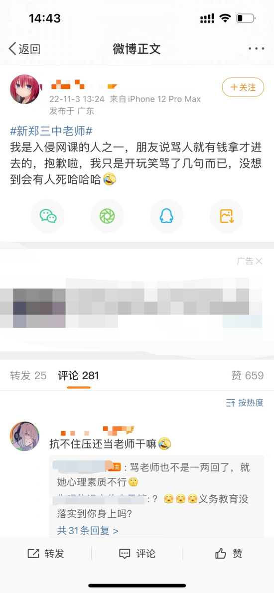 “12号的时候,我和几个同学就都有给刘老师发消息提建议,想着管一管那些扰乱课堂秩序的人。”新郑三中的学生小南告诉记者,自他们转至线上网课后,班上的多门课程就遭遇了“网课入侵”,“我印象里,12号、14号、21号,连着好几次,历史课都有人来捣乱,刘老师被气到带着哭腔跟我们说上自习吧。”而此前刘女士的大女儿晒出的母亲手机的截图也证实了小南的说法。