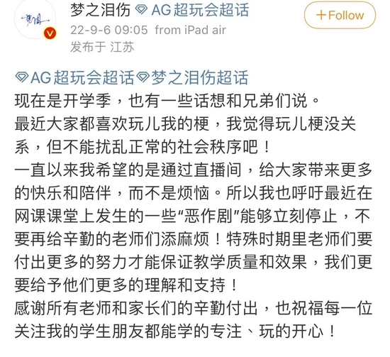 电竞选手“梦之泪伤”微博呼吁停止网络课堂上的“恶作剧”。