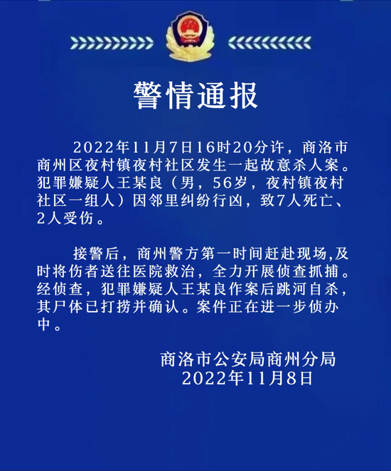 2022年11月7日16时20分许,商洛市商州区夜村镇夜村社区发生一起故意杀人案。犯罪嫌疑人王某良(男,56岁,夜村镇夜村社区一组人)因邻里纠纷行凶,致7人死亡、2人受伤。